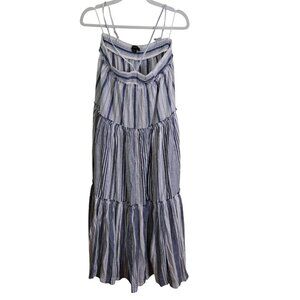 This J.Crew chambray coverup dress features a stylish stripe halter design with adjustable straps and handy pockets. Made from a heavyweight linen blend, it offers a comfortable fit and a tiered midi silhouette, perfect for beach days or casual outings.