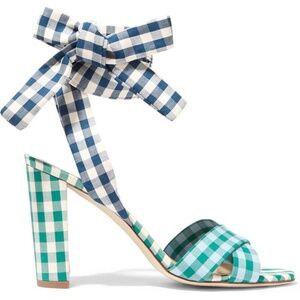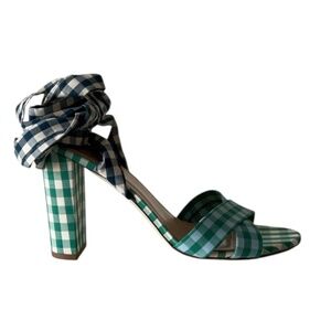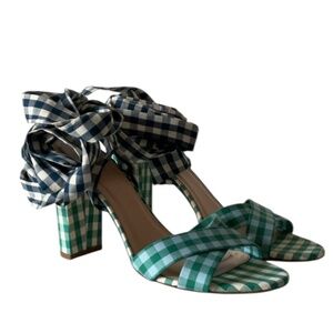 J.Crew Charlotte Mixed Gingham Poplin Heeled Sandals With Ankle Wrap, size 9.5