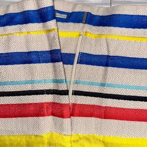 Beige with assorted size royal blue, yellow, light blue, black, and red horizontal stripes