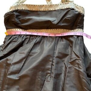 This elegant piece features a chic babydoll silhouette in a rich chocolate brown (or black) main color with contrasting lighter trim along the straps and hem. Crafted from a luxurious silk-linen blend with a 100% silk lining and 100% cotton trim.