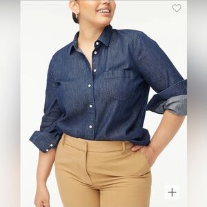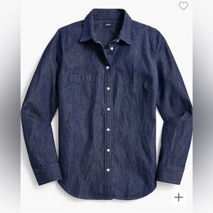 This J. Crew Factory button-up shirt in a dark wash blue chambray is perfect for any casual occasion. The collared neckline and classic/fitted long sleeves add a touch of preppy style, while the button closure and accents give it a classic look. Made of 100% cotton, this shirt is lightweight, breathable, and easy to care for, making it suitable for all seasons.