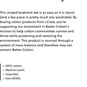 Like new, the classic J.Crew summer staple. This is from the real J.Crew, not the factory store. 100% cotton for comfort. Measurements are 19.5” pit to pit, 22” length shoulder to hem, 19” sleeves are 3/4 length. There is a super tiny speck of light tan something on one stripe as shown in the picture. It’s so small I didn’t see it until I inspected up close, but I wanted to tell you.