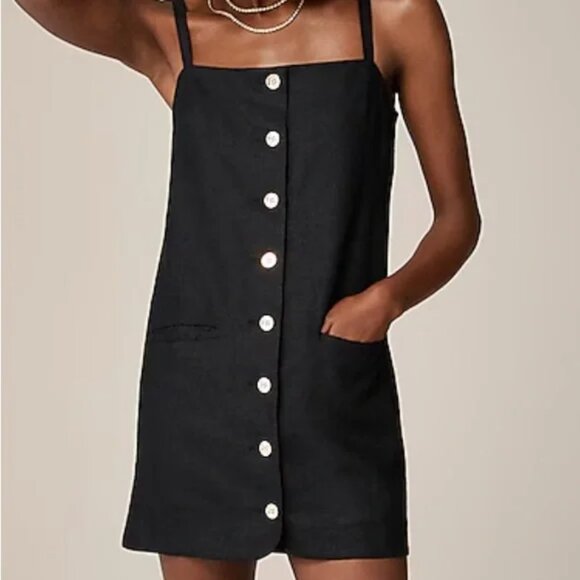 JCrew Claudia Dress Black 100% Linen Button Front Preppy Classic B43