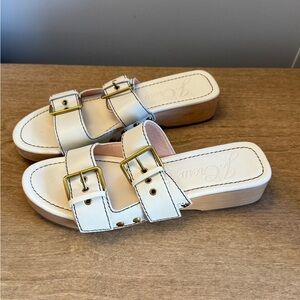 JCrew Double strap buckle closure in Nude Cream w gold tone hardware low wood block heel .