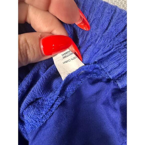 Vibrant cobalt blue shorts by J.Crew, made from 100% cotton with a unique textured floral pattern. These pull-on shorts feature an elastic waistband and side pockets for comfort and functionality. Perfect for warm-weather outings or relaxed weekend wear. Size 6.