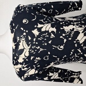 Chic and comfortable, this J.Crew Collection dress features a navy and ivory abstract floral print on soft 100% cotton knit fabric. The classic silhouette includes a boat neckline, 3/4 sleeves, and a tailored fit that flatters the figure. Perfect for work, brunch, or casual events.