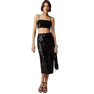 Turn heads in this rare J.Crew Collection sequin fringe skirt, a sold-out limited edition piece. Designed with a sweater-knit base layered in shimmering black sequins, this high-waisted midi moves beautifully with every step and catches the light effortlessly. Perfect for cocktail parties, holiday gatherings, or a night out, it blends elegance and comfort in one stunning statement piece.