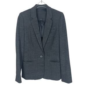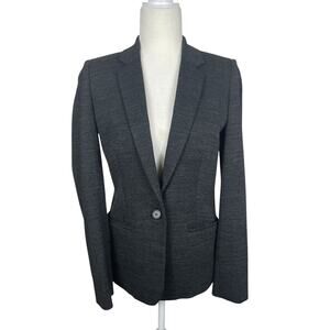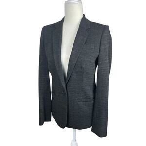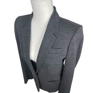 A beautiful mens wear inspired one button front blazer. Does have some stretch to it and is very soft. Black and gray. Size 2. There is no fabric tag. Please see photos for measurements.