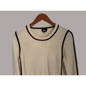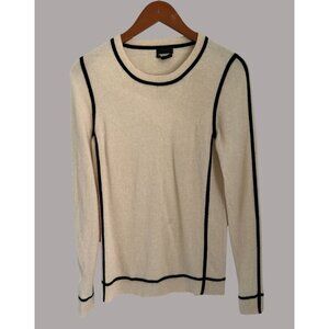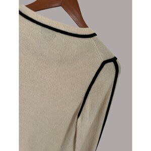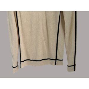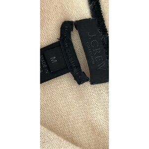 Crafted with the elegance of Italian cashmere, this J.Crew sweater envelopes you in warmth and sophistication. Beige fabric is delicately accented with black trim, creating a timeless design. The soft texture and tailored fit make it a luxurious addition to your wardrobe. A blend of comfort and classic style.