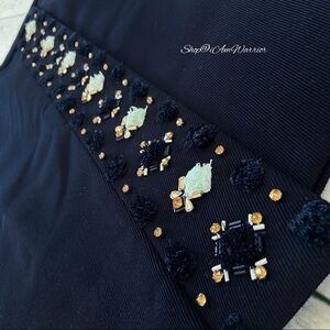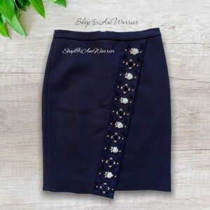 Just in: J.Crew Collection navy pencil skirt with asymmetrical faux wrap front adorned with embellished jewels. Bonded twill fabric is perfect for seasonless wear with a crisp button down. Shown here with my Boden ruffle top, sold separately. NWOT/flawless, size 4. Fits 4/6. See photos for measurements.