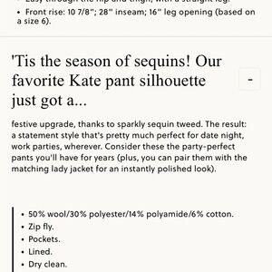 Per JC, "Tis the season of sequins! Our favorite Kate pant silhouette just got a festive upgrade, thanks to sparkly sequin tweed. The result: a statement style that's pretty much perfect for date night, work parties, wherever. Consider these the party-perfect pants you'll have for years.โ