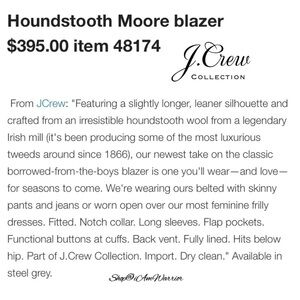 Anyone that shops my closet knows my passion for finding specialty J.Crew items, especially Collection and rare pieces! It's labor-intensive, especially finding rare catalog photos of these items, but that's what I love most about being a reseller. J.Crew is THE master of impeccably tailored coats and blazers, especially this rare moss green, steel gray with tiny flecks of mustard gold houndstooth Collection 2-button blazer crafted from legendary Irish mill, Magee ofDonegal. With it's menswear inspired style plus longer & leaner silhouette, you'll cherish this for years! Gray felted under-collar, silk lined sleevesโฆGORGEOUS! Mint condition, retailed at $395. Listing at retail due to rarity/condition. Size 12, see photos for measurements.