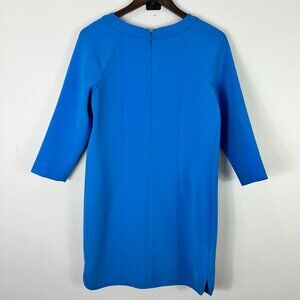This J.Crew Collection shift dress is crafted from a luxe triacetate blend in a rich cobalt blue with clean minimalist lines and a structured silhouette. Features 3/4 sleeves, crew neckline, hidden back zip, and subtle rear hem vent. Sophisticated and timeless—perfect for office, events, or elevated everyday wear.