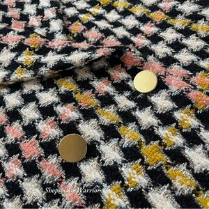 Just in: Blogger and celeb favorite is this J.Crew double breasted wool coat in a gorgeous large check houndstooth pattern of black, ivory, marigold and pink color way. Metallic thread & gold buttons add to itโs luxurious style. EUC. Size 8. Relaxed fit. See photos for measurements.