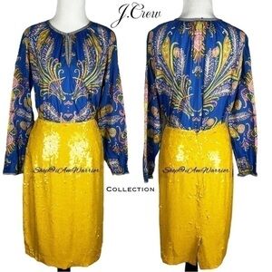 J.Crew Collection hand applied sequin no.2 pencil skirt in the most gorgeous & rare shade of marigold yellow is perfect with a chambray top, crisp button down or my J.Crew feather print blouse (shown here, sold separately). EUC, retailed for $695. Generously price at $100 off! Size 8, see photos for measurements.
