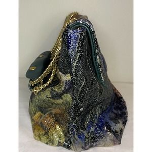 From 2011 JCrew: “Introducing a unique silhouette inspired by the art of origami—it took us months to cut the leather just so and achieve the artful folds we were after. Featuring a delicate webbed overlay of sequins in a feminine floral print (a distinctive design that hails from Gratacos in Barcelona, one of the world's most creative and innovative mills). An interior front-wall patch pocket and a back-wall zip pocket keep pencils, cell phone and keys organized. Cotton with rayon sequins and leather trim. Chain handle. Flap with lock closure. Brass-finish hardware. Exterior back-wall pocket. Cotton twill lining. Part of J.Crew Collection. Import. 12 1/2" handle drop. 9"H x 12"W x 6"D"