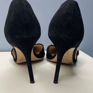 These are stunning! Black suede with leather lining. Made in Italy. Shimmering crystal florets are sewn into the sequin flowers on the toes. Heel is 3.5”. Excellent condition. It looks like there are 2 missing crystals but you must look closely to see. Some minor wear on the bottom from the one event.