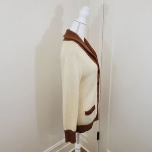 Brown and Cream white colors. Fold over collar. Button up closure.