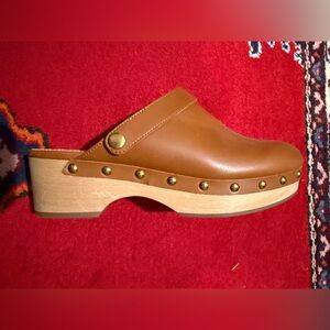 As seen in our fall campaign... With a geniune wood sole, traditional stud detailing and a soft leaather upper, these clogs just might be the only shoes we want to wear come f Bonus: the convertible strap can be worn two ways—around the back of the heel for additional stability or over the top of the foot for slide-in ease. Please note, for the best fit we suggest ordering one half size larger than your usual size.