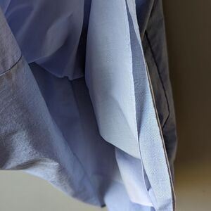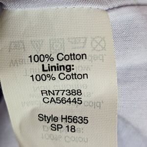 Good pre-owned condition. No stains. There was a double hole made with the tagging machine at the shoulder of the ruffle (see photo).