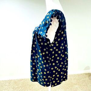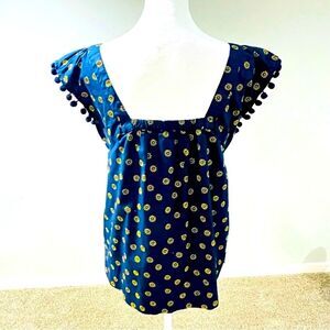 J.Crew Cotton Poplin Square Neck Navy and Yellow Daisy Print Pom-Pom Top Size 6