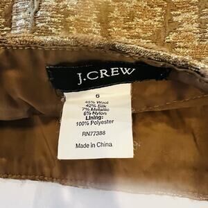 This is a J.Crew pencil skirt in size 6, crafted from a brown wool blend fabric with a crackled copper finish. It features a zip closure, knee-length, straight & pencil style, and is lined for comfort. The skirt has a metallic theme, making it a stylish choice for various occasions.