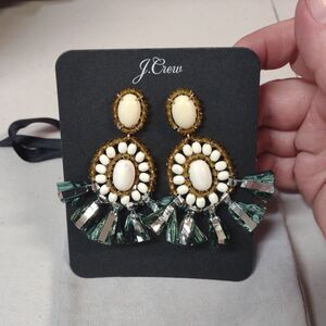Chic J. Crew earrings with cream stones and dark green fringe. Perfect for adding flair to any outfit.
