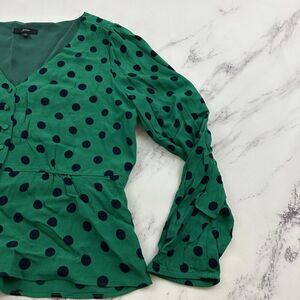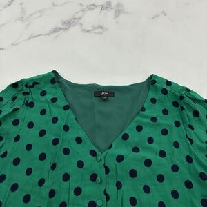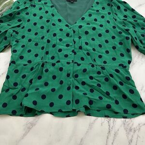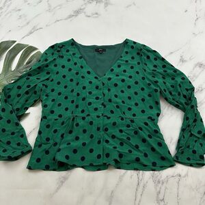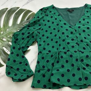 J.Crew women's green and blue polka dot crepe peplum top, size 14. It is free from any rips or stains. It measures about 44 inches around the bust and is about 23 inches long.