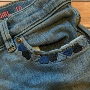 Pockets on the front and on the seat. Embroidered heart detail on the front pockets. Hidden adjustable waist. Intentional fade. Can be worn as shown or cuffed. Good used condition.