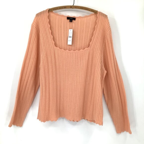 J.Crew Cropped Sweater 2X Peach Scalloped Neckline Long Sleeve 100% Merino Wool