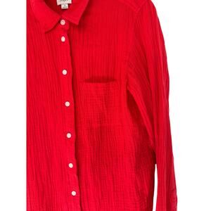 Add a pop of color to your wardrobe with this vibrant J.Crew Double Gauze Button-Up Shirt. The bright cerise orange is perfect for adding a cheerful touch to any outfit. Crafted from soft and breathable double gauze cotton, this shirt offers ultimate comfort and a relaxed fit.