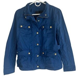 Gorgeous blue field jacket from J.Crew. This is a resin-coated cotton material with gold hardware. Size Small and in great preowned condition; no visible flaws.