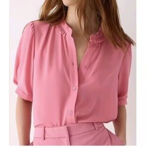 “Elevate your wardrobe with this J.Crew button up top in a beautiful shade of pink. The top features a collared neckline, short sleeves, and a button closure. It has a regular fit and is made of lightweight and breathable material. Features ruffle accents adding a touch of style to your outfit.”