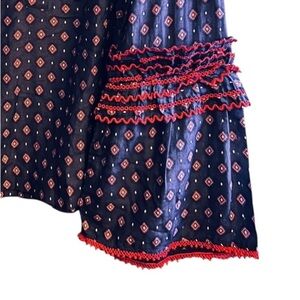 J.Crew Embroidered Bell Sleeve Top in foulard cotton/silk blend. Beautiful boho-inspired blouse with round neckline, long bell sleeves, delicate embroidery, and a front button closure. Made of 70% cotton and 30% silk, it offers both comfort and elegance. Flat Measurements (approx.), 35.5" bust , Sleeves: 23", Length: 24". Condition: NWOT | Size: 8 | Color: Blue & Red. Perfect for work, brunch, or casual outings, this versatile blue blouse adds a polished yet relaxed touch to any wardrobe. Top-rated seller, same-day shipping! Bundle & save!