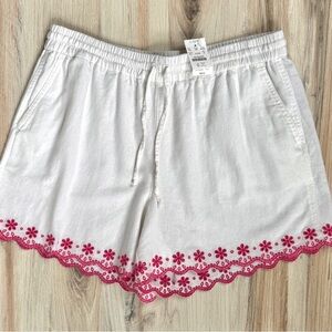Adorable linen drawstring short with pink embroidered trim. Generously sized IMO. Perfect for summer or the beach!