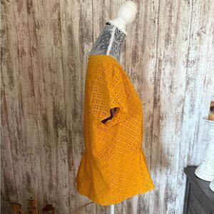 The Eyelet Peplum Top by J. Crew in Mustard Yellow. Allover eyelet detailing. Button front closure. Cap sleeves. Peplum silhouette. Gently worn with no visible flaws. Measurements in photos. Size 14.