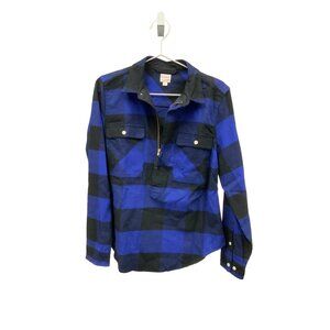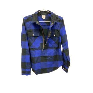 This J.Crew Factory shirt jacket combines contemporary style with classic comfort. Its blue and black buffalo check pattern adds a trendy touch, while its cotton fabric ensures breathability and ease of movement. The half zip closure offers versatility, making it suitable for layering. Ideal for enhancing any wardrobe with a stylish edge.