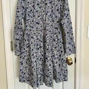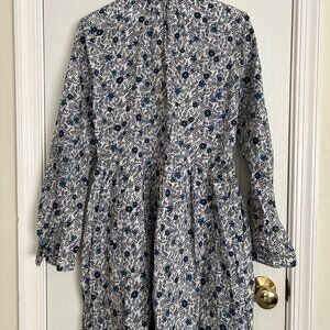 White dress with dark blue floral print. Runs a bit large; 100% cotton. Worn once. Slight blue discoloration on left elbow