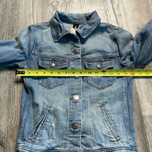 J.Crew Factory Distressed Denim Jacket, size xx small. In excellent used condition. See pictures for measurements and fabric content.
