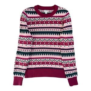 Cozy and classic, this J.Crew Factory sweater features a colorful Fair Isle knit pattern in shades of pink, burgundy, green, and ivory. Crafted from 100% cotton, it’s soft, breathable, and perfect for layering in cooler weather. Ribbed crew neckline, cuffs, and hem add a polished finish.
