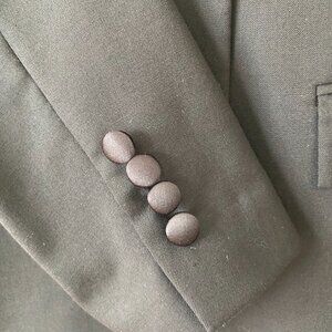 Some alterations have been made. Jacket has been let out slightly. Jacket has had the plastic buttons that JCrew sells this item replaced with black satin covered buttons, and matching black satin buttons added to sleeves. Pants have had suspender buttons added inside the waistband.