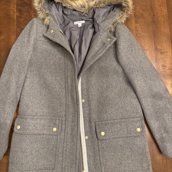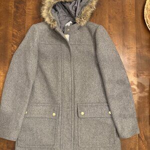 Stay stylish and warm in this classic J.Crew Mercantile peacoat in elegant gray. Featuring a faux fur-trimmed hood and gold-tone zipper and snap accents, it’s perfect for layering on chilly days.