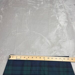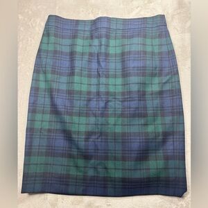 Wool blend, some stretch, lined, zippered back, pencil skirt, tartan plaid print in blue, black and green. Holiday, Christmas, contemporary, office, career, business, academia, preppy, countryside