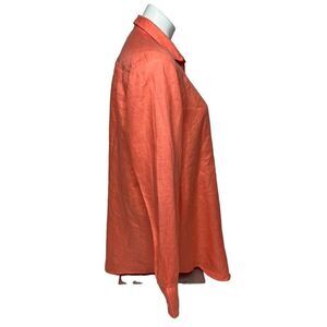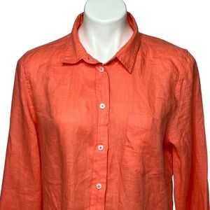 J. Crew Factory peach linen long sleeve button up shirt size L. Style G5617. 100% linen. Small stain on front (see photos) but otherwise good condition Length 29” Chest 20”.
