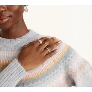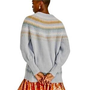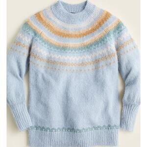 Elevate your wardrobe with this charming J.Crew Fair Isle sweater. Crafted from a soft alpaca wool blend, this sweater features a classic Fair Isle pattern and stylish puff sleeves, adding a touch of whimsy to your look. The color is Dusty Sky Peach.