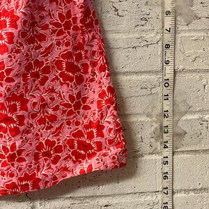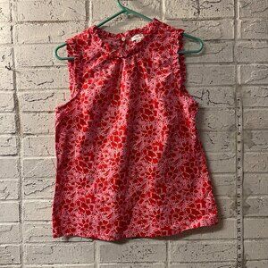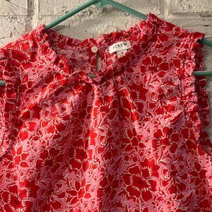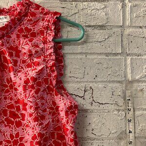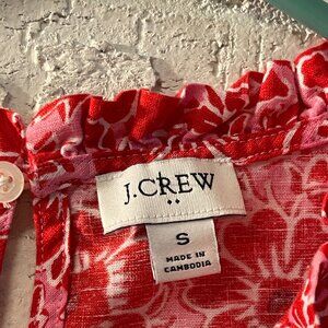Bold and vibrant, this J.Crew sleeveless top brings a pop of color with its floral pattern in red and white. Crafted from a lightweight linen and cotton blend, it’s perfect for warm-weather layering or as a standalone statement piece. Featuring a ruffled neckline, button closure at the back, and delicate details along the sleeves, this top is effortlessly chic and feminine.