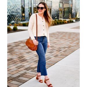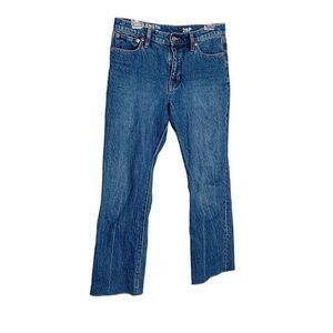 Condition is preowned. Modeled photos show similar styles, not necessarily the same pair. These are a beautiful, dark wash. High-rise. Raw hem. Zipper and button closure. They are the full length style, but they fit me (5’6”) cropped. They are also a petite. Boot cut style with slight flare at the bottom. From Spring 2022.