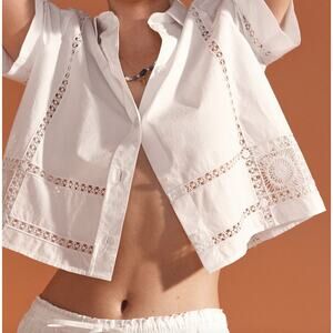 J.Crew Gamine Eyelet Trim Shirt Cotton White Short Sleeve Resort Boho US 12 NWT.