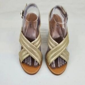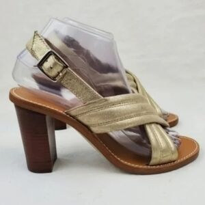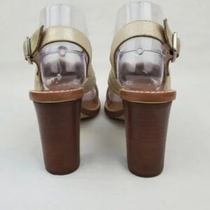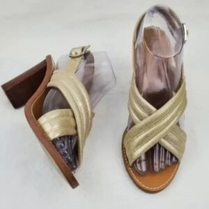 Chic gold sandals with a sturdy block heel. Ideal for stylish outings.