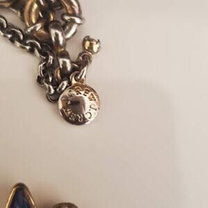 J.Crew necklace has green resin beads with purple and clear rhinestone accents. Gold tone chain shows some wear to the finish, but over all very good condition. Adjusts from 18 to 20 inches.